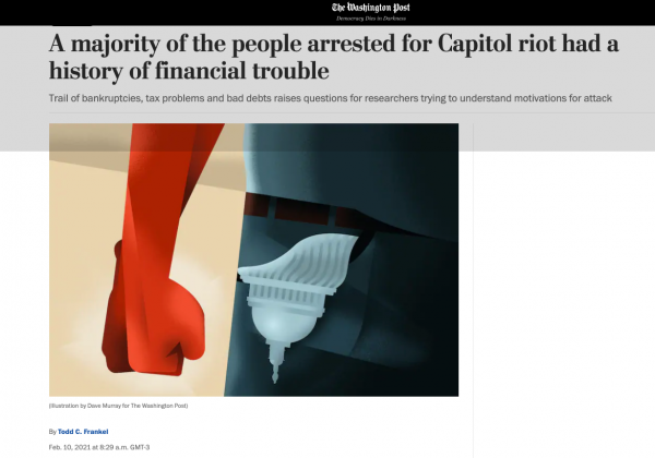 Nearly 60 percent of the people facing charges related to the Capitol riot showed signs of prior money troubles, including bankruptcies, notices of eviction or foreclosure, bad debts, or unpaid taxes over the past two decades, according to a Washington Post analysis of public records for 125 defendants with sufficient information to detail their financial histories. . . . The group’s bankruptcy rate — 18 percent — was nearly twice as high as that of the American public, The Post found. A quarter of them had been sued for money owed to a creditor. And 1 in 5 of them faced losing their home at one point, according to court filings.
