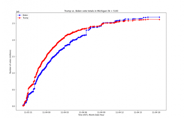 The believability of these updates relies on the premise that the one or two most Biden-favoring parts of the state (perhaps by ballot type) were counted entirely in these two batches. If it cannot be shown that the ballots counted during these spikes were qualitatively different from all other vote updates in Michigan, then the results are likely too extreme along multiple dimensions to be accepted at face value. [Vote Integrity]