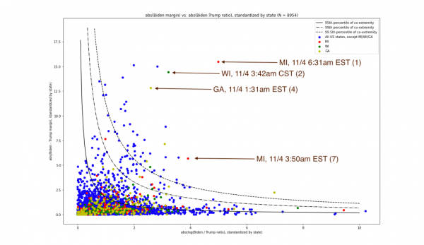 It goes on to describe how the same logic applies for the other updates as well. Large ballot dumps which heavily favor a candidate make sense, if there are also smaller ones which favor the candidate more. The “standardization” process used by the researchers here takes care of that, and shows how points up and to the right of the graph are the more “co-extreme” vote dumps, in the language of the report: