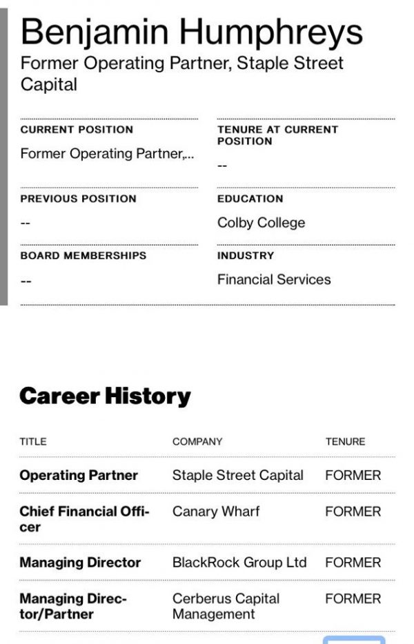 Operating Partner of Staple Street Capital. He has experienced in Canary Wharf as a Chief Financial Officer and