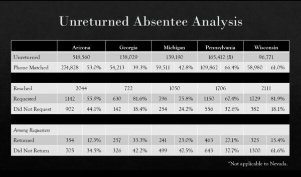 In the five states that required a requested ballot, Braynard’s team found a significant number of people whom the state marked as having requested a ballot but not having returned it. Upon contacting those people, Braynard said many of them told his call team that they hadn’t requested a ballot at all. Others said they had requested and returned the ballot, but it hadn’t been marked as received or counted.