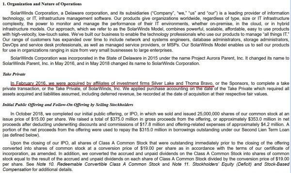 If you look up SolarWind’s 10K on the SEC website, EDGAR, you’ll find that the company was acquired in February 2016 by investment firms Silver Lake and Thoma Bravo. Then in 2018, the company went public through an Initial Public Offering (IPO):