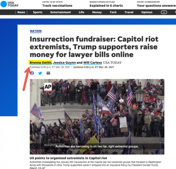 In other words, the only purpose of the article — headlined: “Insurrection fundraiser: Capitol riot extremists, Trump supporters raise money for lawyer bills online” — was to pressure and shame tech companies to do more to block these criminal defendants from being able to raise funds for their legal fees, and to tattle to tech companies by showing them what techniques these indigent defendants are using to raise money online.